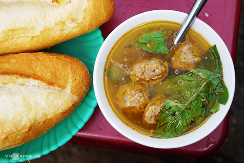 Bánh mì xíu mại của chị Trúc đơn giản là bánh mì ăn kèm một chén nước dùng trong veo với một chút váng mỡ béo ngậy, chan ngập những viên xíu mại tròn, nêm nếm đậm đà. Suất ăn không thể thiếu húng quế cho dậy mùi thơm.