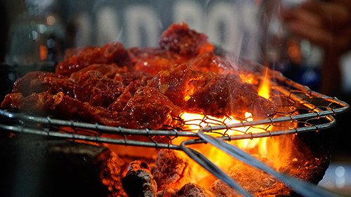 Những miếng thịt bò mềm được ướp kỹ, nướng trên bếp than hồng tỏa mùi thơm níu chân thực khách đến quán Dã Chiến.