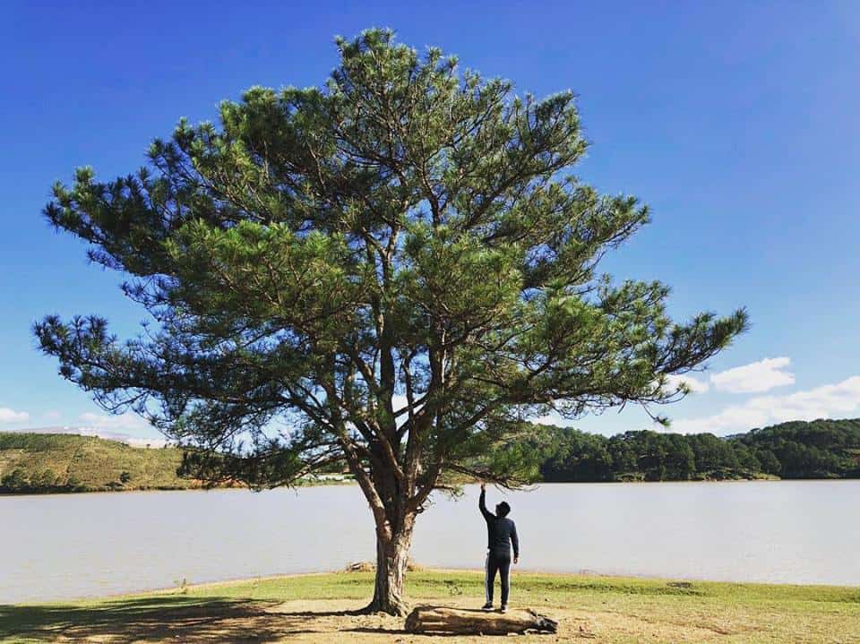 Khi đến nơi, khu cắm trại tại cây thông cô đơn sẽ khiến bạn yêu ngay cái nhìn đầu tiên với khung cảnh nên thơ, một bên là hồ nước trong veo, một bên là ngọn núi Lang Biang huyền thoại bạt ngàn thông xanh và bờ hồ Đan Kia – Suối Vàng yên ả.