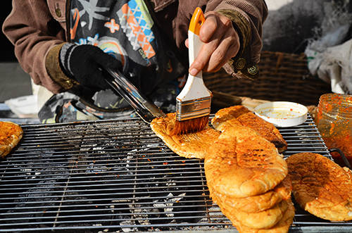 Ổ bánh mì được nướng trên bếp than hồng hấp dẫn thực khách. Ảnh: Phong Vinh.