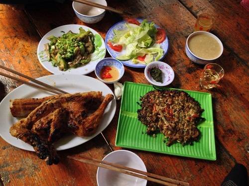 Gà nướng phải liên hệ trước: Trên đường tới làng Cù Lần có quán gà nướng, heo rừng nướng rất ngon và muốn ăn bạn phải theo quy định của chủ quán như gọi đặt trước một ngày, đến trễ thì về, ăn theo đúng thứ tự sắp xếp… Gà nướng ở đây là gà ta, thịt chắc và dai, da gà được nướng giòn rụm như chiên; quán có thêm cơm lam, lòng gà xào mướp… Giá cho hai người ăn khoảng 400.000 đồng. Ảnh: Lozi.