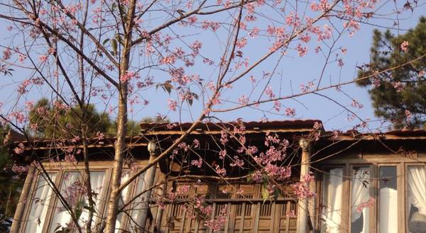 Hoa mai anh đào nở rực rỡ phía trước phòng nghỉ.