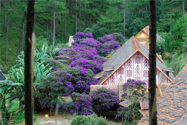 Giữa bốn bề cây cỏ xanh tươi mát, bỗng xuất hiện những đốm lửa tím điểm tô cho không gian thêm phần dịu dàng, lãng mạn. Từng khóm hoa tím đậm như khẽ “đậu” trên tán cây xanh, vươn mình lên mái nhà, thổi bừng lên một cảm giác tươi mới cho núi rừng nơi đây. Trong cái không khí mát lạnh dễ chịu của Đà Lạt, thật không gì hơn khi được thư thả ngắm sắc tím dịu dàng của hoa Pơ Ra Nhằng và tạm gác hết những muộn phiền, mệt mỏi của cuộc sống thường nhật sang một bên.