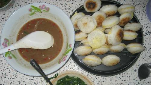Chiếc bánh khá to nên khi ăn bạn phải cắt nhỏ thành từng miếng, chấm với nước me chua chua trộn chung với tương ớt. Vị cay nồng trong nhân bánh càng khiến cho bạn cảm thấy ấm áp hơn giữa cái lạnh trời đêm ở phố núi.