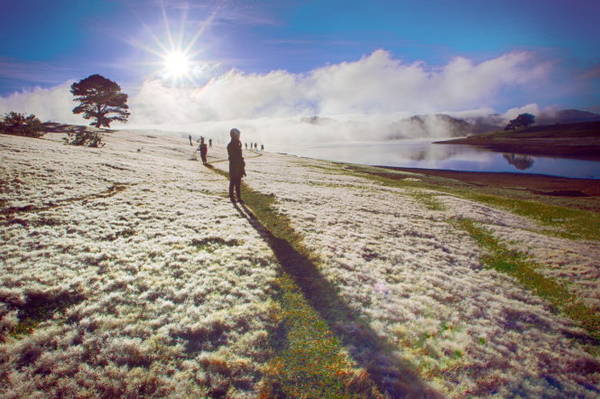 Du khách chụp ảnh với cỏ hồng đang phủ sươngDu khách chụp ảnh với cỏ hồng đang phủ sương